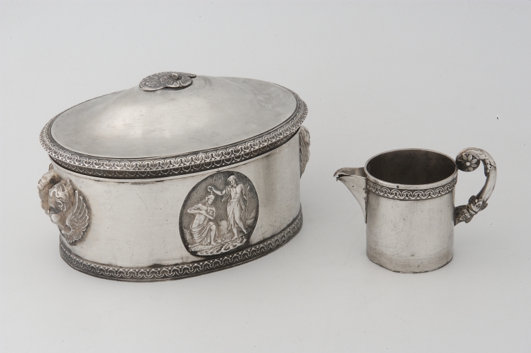 Service de baptême : coffret ; ampoule à saint chrême ; verseuse,