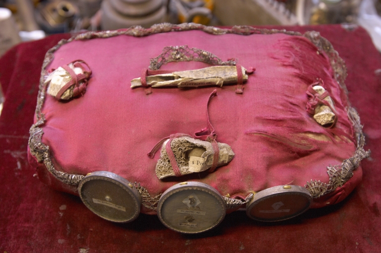 Châsse-reliquaire : détail coussin avec reliquesImmatriculation