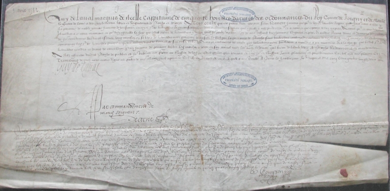 Manuscrit : autorisation donnée de construire un moulin à escuyer François de Harscouët, le 8 avril 1582 (AD 22)Immatriculation