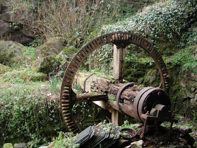 Vue de détail du système de transmission de la roue verticale, l'arbre de couche et la grande couronne dentéeImmatriculation