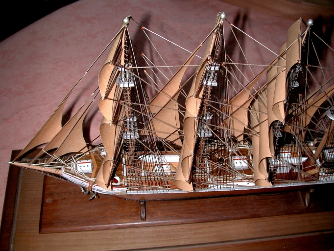 Vue en plongée des détails du 3/4 avant de la maquette de navire Cap-HornierImmatriculation