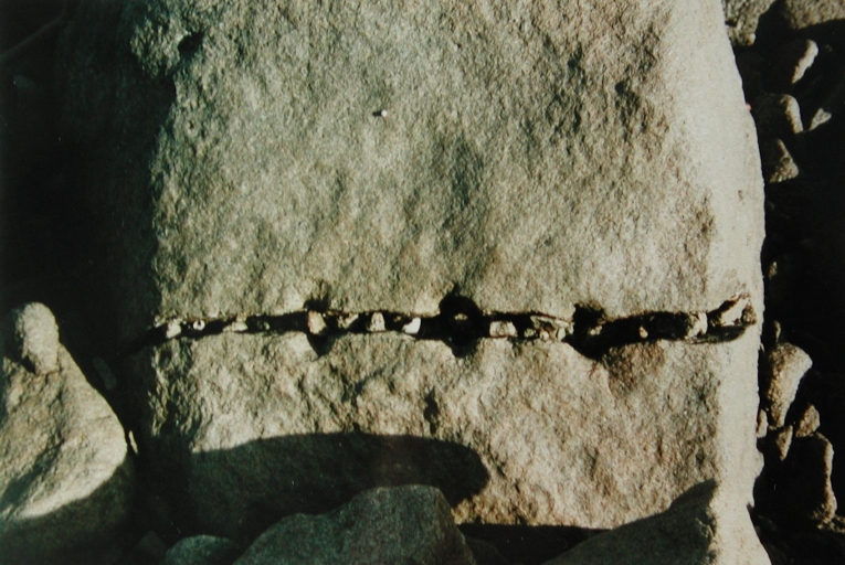 Bloc de granite bleu fendu, trouvé à 100 m au sud de Port Gélin : trous de forage à la chante-perce (UTL Lannion)Immatriculation