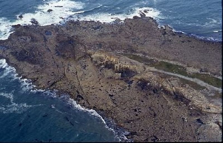 Vue aérienne de l'Île du Renard : extraction intense sur l'estran nord-est, vestiges de construction sur le sommet et déchest de taille (Paris, UTL Lannion)Immatriculation