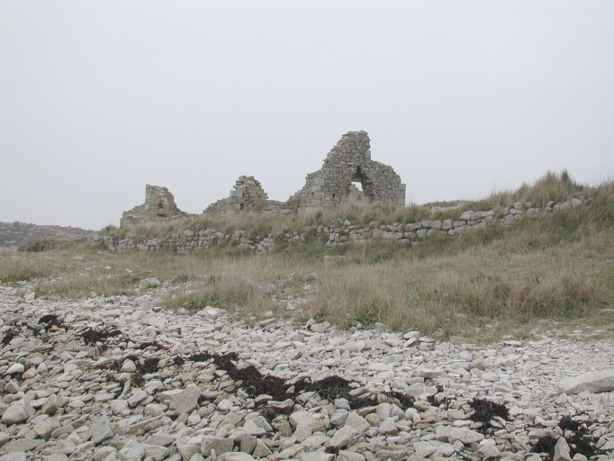 Vue générale des anciens bâtiments des goémoniers : remarquer le muret en bordure de grèveImmatriculation