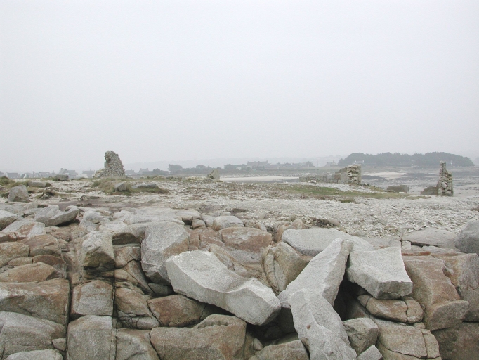 Déchets de taille en haut de l'estran : remarquer les cristaux de mica blanc du graniteImmatriculation