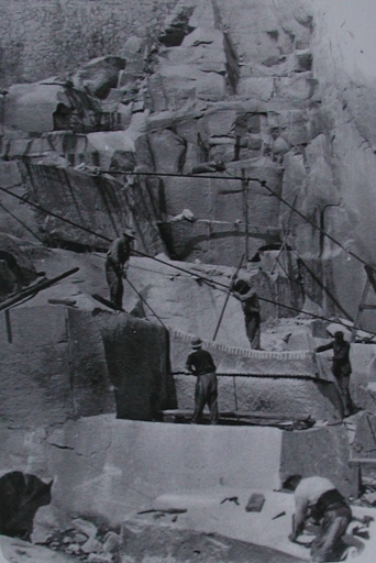 Utilisation de diiférents outils dans la grande carrière de l'Île Grande, 1930 (Collection particulière)Immatriculation