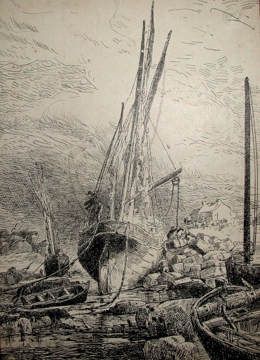 Dessin de L. M. Faudacq : chargement de blocs de pierres taillées sur la grève, fin 19ème siècle (collection particulière).Immatriculation