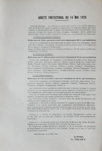 Arrêté préfectoral (copie) du 14 mai 1926 fixant le tarif des concessions pour occuper les plages du Domaine public maritime (AD 22)Immatriculation