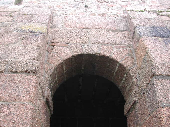 Vue en contre-plongée de la poterne aval en plein cintre avec ses contrefortsImmatriculation