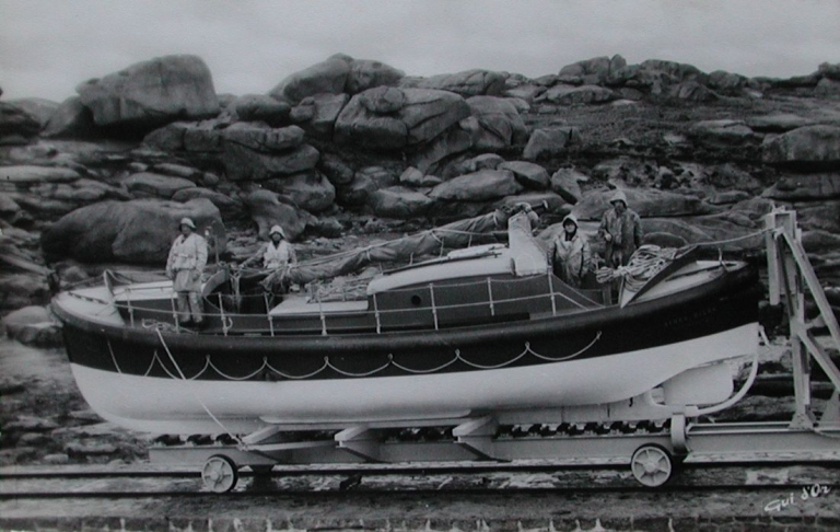 Le canot Aimée-Hilda sur son chariot, à Pors-Kamor vers 1955-60 (collection particulière)Immatriculation