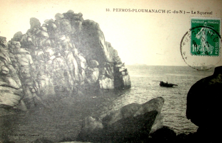 Vue générale d'un bateau en situation de pêche à l'attrappe devant le Rocher aux Mulets au 1er quart du 20ème siècle à Ploumanac'h (collection particulière)Immatriculation