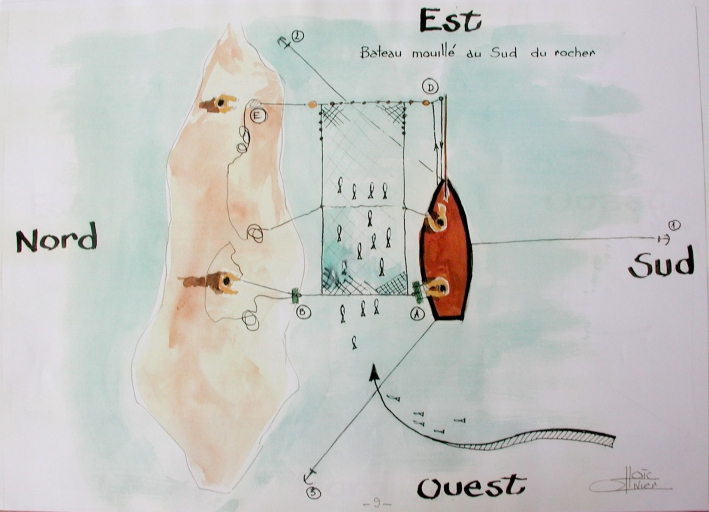 Dessin n°6 représentant une scène de pêche à l'attrappe selon les conditions de vent (Loïc Ollivier)Immatriculation