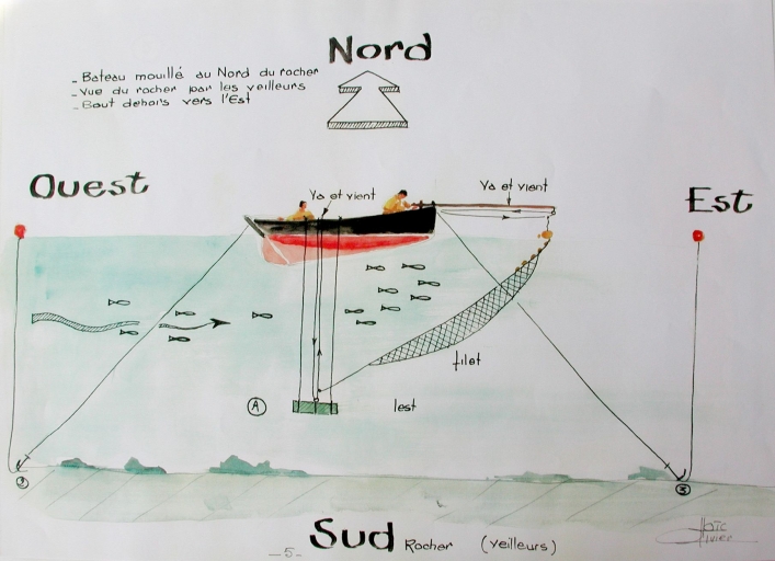 Dessin n°13 : descriptif du positionnement du bateau et du filet pour la pêche à l'attrappe selon la direction du vent (Loïc Ollivier)Immatriculation