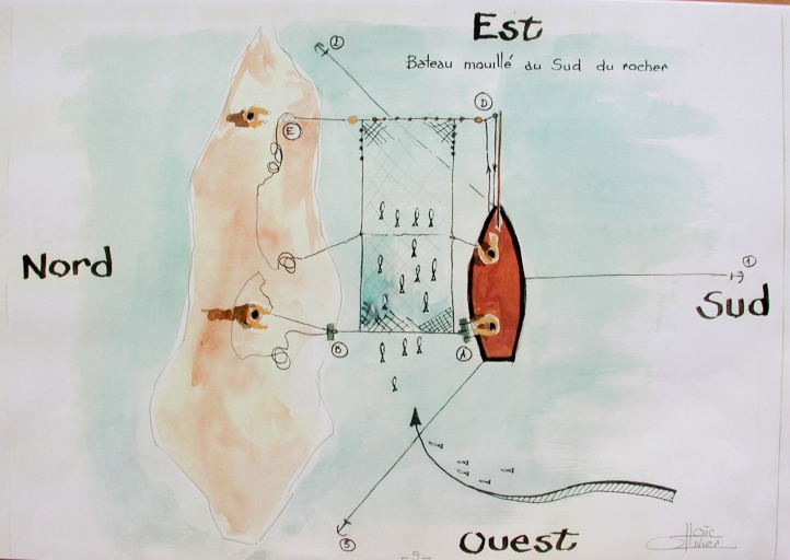 Dessin n°16 : descriptif du positionnement du bateau et du filet pour la pêche à l'attrappe selon la direction du vent (Loïc Ollivier)Immatriculation