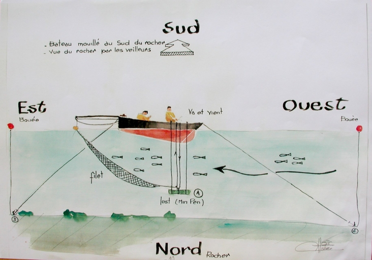 Dessin n°15 : descriptif du positionnement du bateau et du filet pour la pêche à l'attrappe selon la direction du vent (Loïc Ollivier)Immatriculation