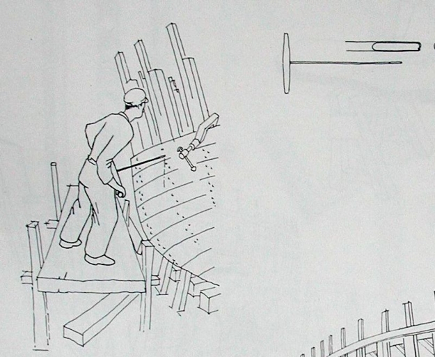 Dessin : utilisation d'une tarière pour percer un bordé (Jean Le Bot)Immatriculation