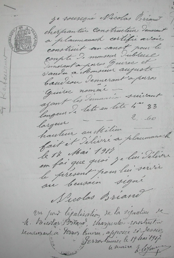 Certificat de construction du canot Loustic par Nicolas Briand, 1917 (collection particulière)Immatriculation