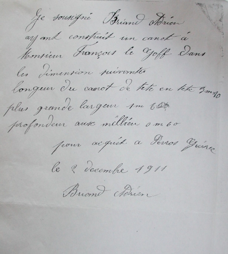 Attestation de construction d'un canot de 5 m par Adrien Briand, 1911 (collection particulière)Immatriculation