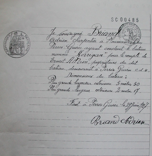 Attestation de construction du canot Korrigan par Adrien Briand, 1927 (collection particulière)Immatriculation
