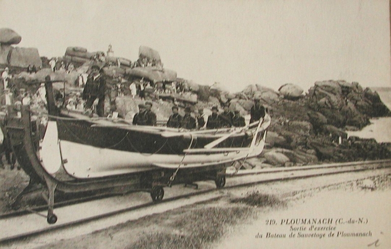 Sortie d'exercice du canot de sauvetage à rames de la station de Ploumanac'h, le Commandant Gentil, patron Yves Geffroy (de 1912 à 1922), au début du 20ème siècle (collection particulière)Immatriculation