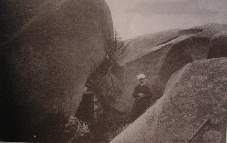 Job la Poulaine devant sa maison troglodyte, dont on peut remarquer le muret et la cheminée dans la rocheImmatriculation