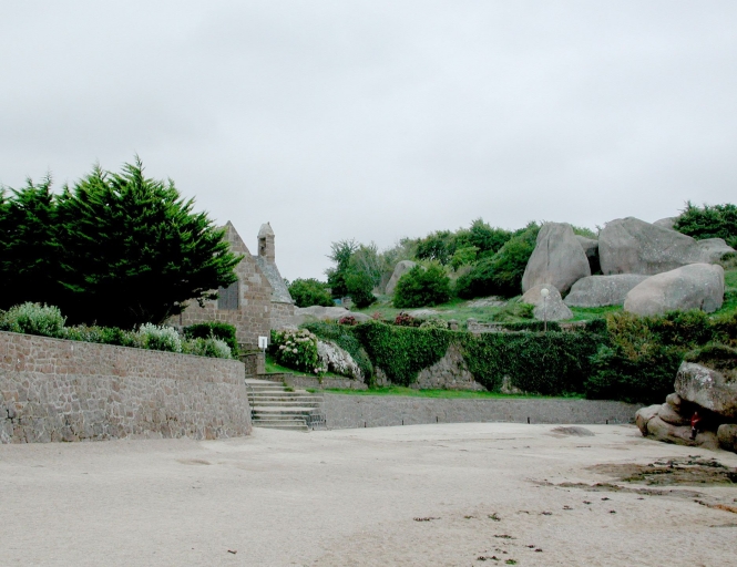 Murs de défense littorale ou de marquage de propriété et aménagements légers devant la chapelle de St-Guirec, remarquer au-dessus les rochers de la Butte au Boiteux et Crec'h JegoImmatriculation