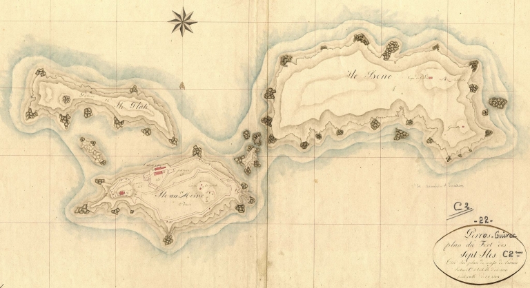 Extrait du plan de masse des Sept-Îles, 1805 : remarquer les éléments bâtis de défense littorale : corps de garde, batterie et guérite (AD 22)Immatriculation