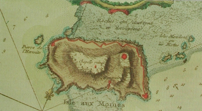 Plan de l'Île aux Moines par Bellin, 1764,Tome V, planche 49 : remarquer les roches Les Mottes au sud-est de l'ile (collection particulière)Immatriculation