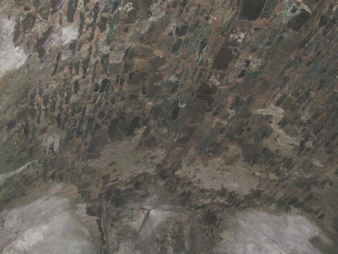 Détail de l'appareillage de la voûte en cours de réfection (couvrant les 2 salles) : joints refaits avec du mortier de brique rougeImmatriculation