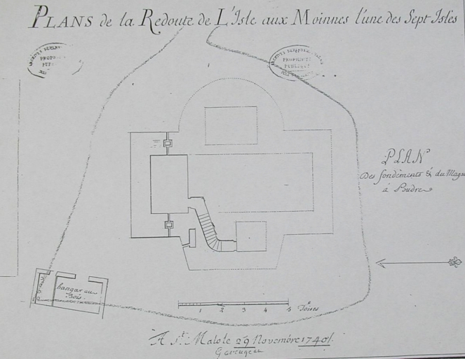 Plan de la redoute de l'île aux Moines, des fondements et du magasin à poudre, par Garangeau, le 29 novembre 1740 (AD 35)Immatriculation