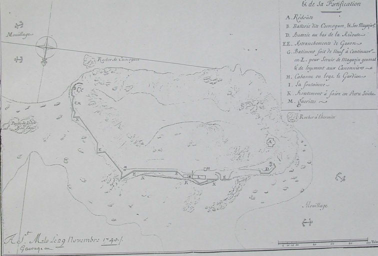 Le plan de l'Île aux Moines et des ses fortifications, par Garangeau, daté du 29 novembre 1740 (AD 35)Immatriculation