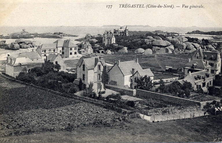 Le paysage maritime et en arrière plan, les terrains encore cultivés entre les dunes et les premières constructions balnéaires, dont le Castel Sainte-Annne et la Villa des Roches datées de 1883 (collection particulière)Immatriculation