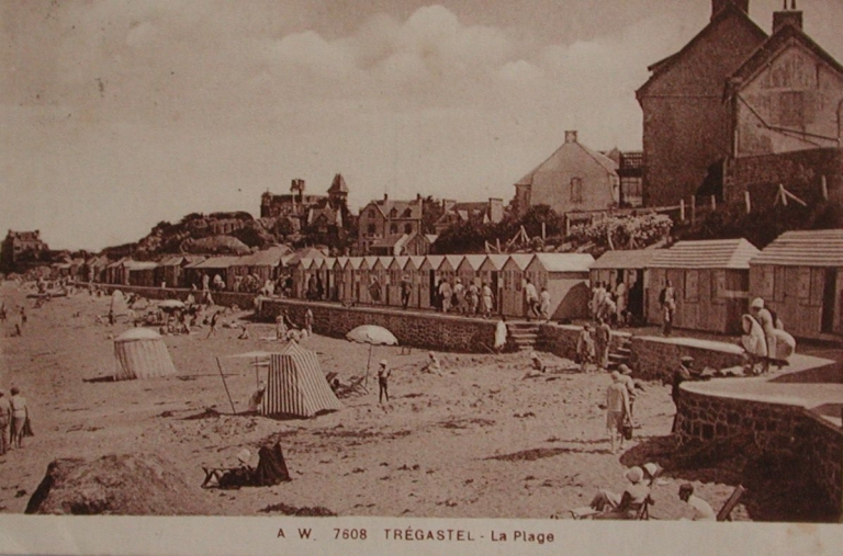 La digue de Coz Pors maçonnée en granit avec les cabines de bains en bois vers 1920 (collection particulière)Immatriculation
