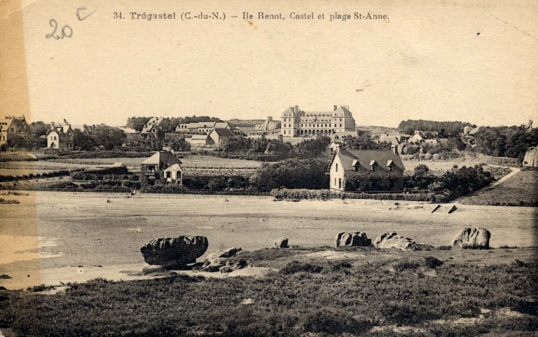 Le front de mer de la baie de Sainte-Anne, au début du 20e siècle : remarquer la 1ère cale devant la maison dite La Dérobée avec le chemin d'accès à l'Île Renoite (carte postale, collection particulière)Immatriculation