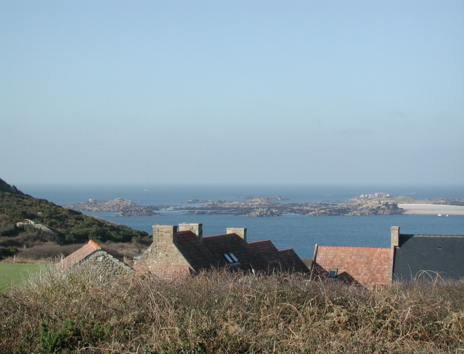 Vue des bâtiments de la ferme avec les couvertures traditionnelles refaites en tuile ; l'environnement insulaire, l'île MolèneImmatriculation