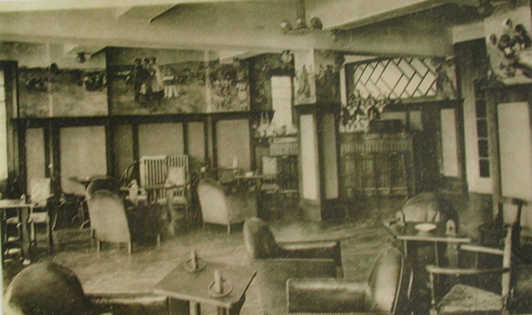 Aménagement du bar de l'Hôtel Bellevue, au milieu du 20ème siècle, avec les fresques de Louis Garin (collection particulière)Immatriculation