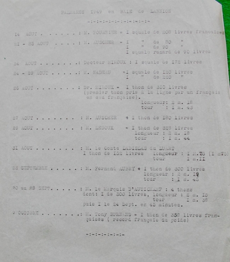 Palmarès des prises de thons et de squales en 1949 en baie de Lannion (collection particulière)Immatriculation