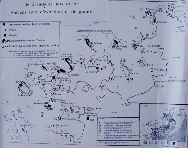 Carte des anciens sites d'exploitation du granite dans les îles et îlots autour de l'Île-Grande (UTL Lannion)Immatriculation