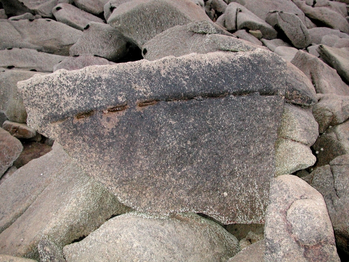 Traces d'utilisation de coins en boius ou de la chante-perce sur les rochers de l'estran (Île Fougère)Immatriculation