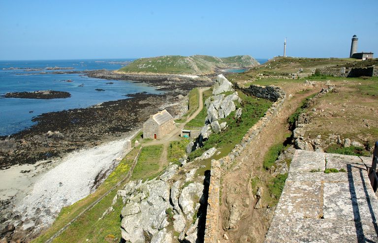 Vue de situation à mi-marée depuis la terrasse de la redoute de la caserne et de la porte commandant l'accès à la cale primitive de l'île aux MoinesImmatriculation