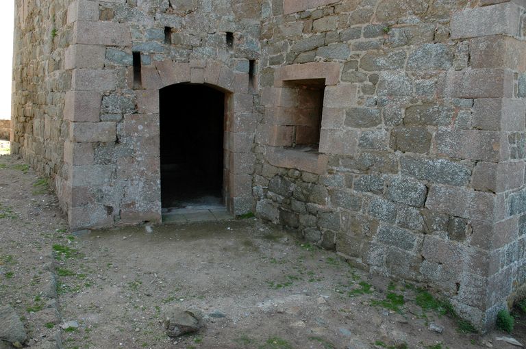 Vue de l'entrée fortifiée de la redoute, réduit de l'île aux Moines : deux baies flanquent l'entrée ainsi qu'un assommoir au dessus de la porte (état 2006 après restauration)Immatriculation