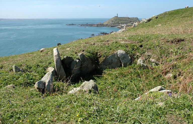 Vue du mégalithe de l'île Bono. Il fut utilisé comme guérite au 18e siècle pour surveiller le large. En arrière-plan : l'île aux MoinesImmatriculation