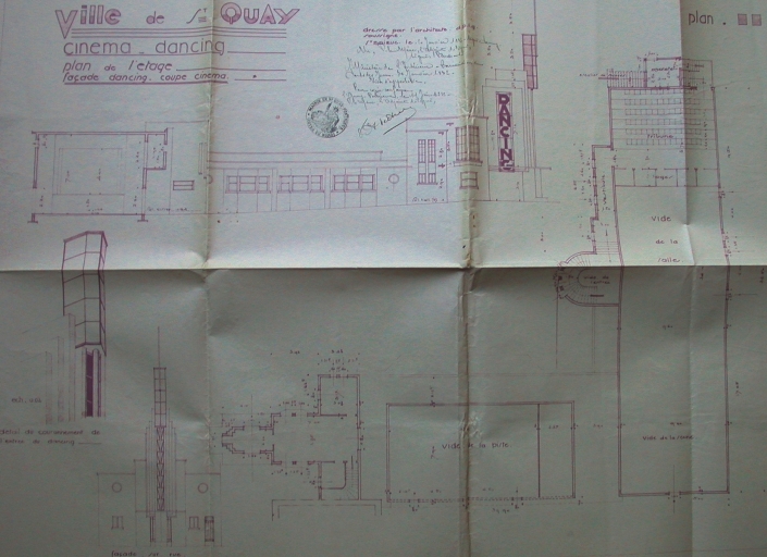 Plan général du cinéma-dancing de Saint-Quay-Portrieux, par l'architecte départemental Jean Fauny, 20 janvier 1932 (AD 22) : plan de l'étage, façade dancing, coupe cinémaImmatriculation