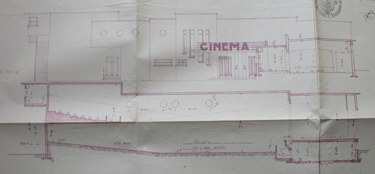 Plan détaillé du cinéma-dancing de Saint-Quay-Portrieux, par l'architecte départemental Jean Fauny, 20 janvier 1932 (AD 22) : façade et coupe longitudinale du cinémaImmatriculation