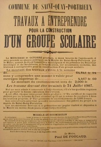 Annonce par voie d'affichage public de l'adjudication des travaux à entreprendre pour la construction du groupe scolaire, affiche par l'imprimeur Fr. Guyon, 1906 (AD 22)Immatriculation
