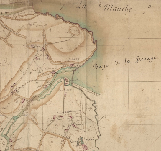 Extrait du cadastre de 1806 : l'embouchure de la vallée de Corbusson : rmarquer les marais que la mer recouvre et les polders (AD 22)Immatriculation