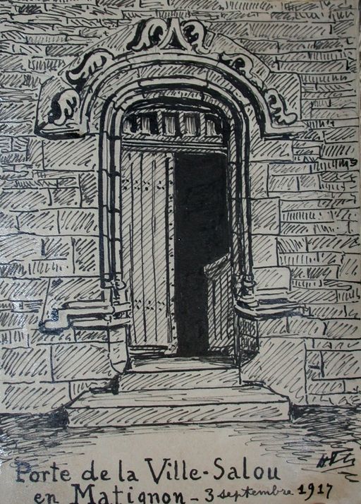Détail de la porte d'entrée, croquis du vicomte Henri Frotier de La Messelière, 3 septembre 1917 (AD 22)Immatriculation