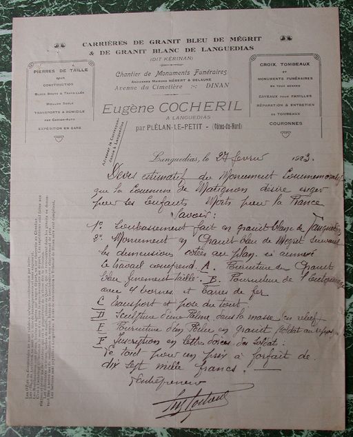 Devis estimatif, par l'entrepreneur Eugène Cocheril, 27 février 1923 (AD 22)Immatriculation