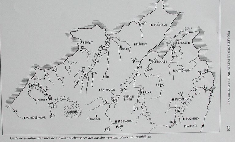 Carte de situation des sites de moulins et chaussées des bassins versants côtiers du Penthièvre (J.P. Le Gal La Salle, 2005)Immatriculation