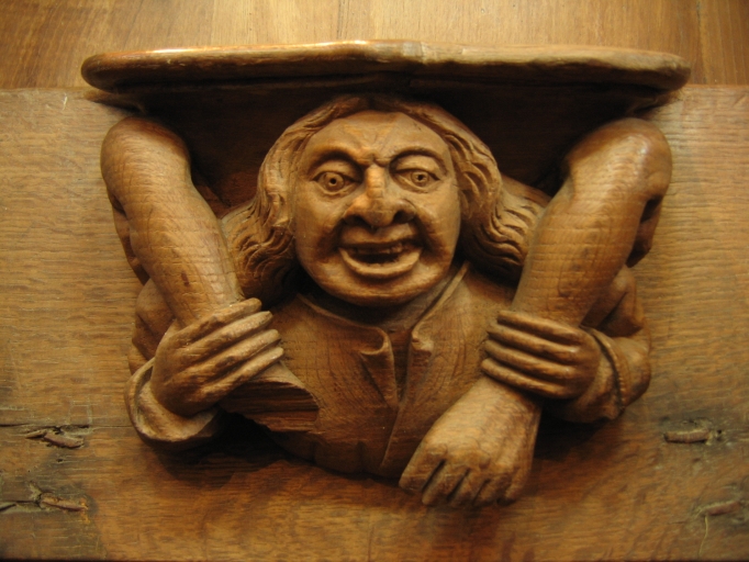 Tréguier, stalles de la cathédrale Saint-Tugdual : un acrobate est ici représenté les jambes passées par-dessus ses épaulesImmatriculation